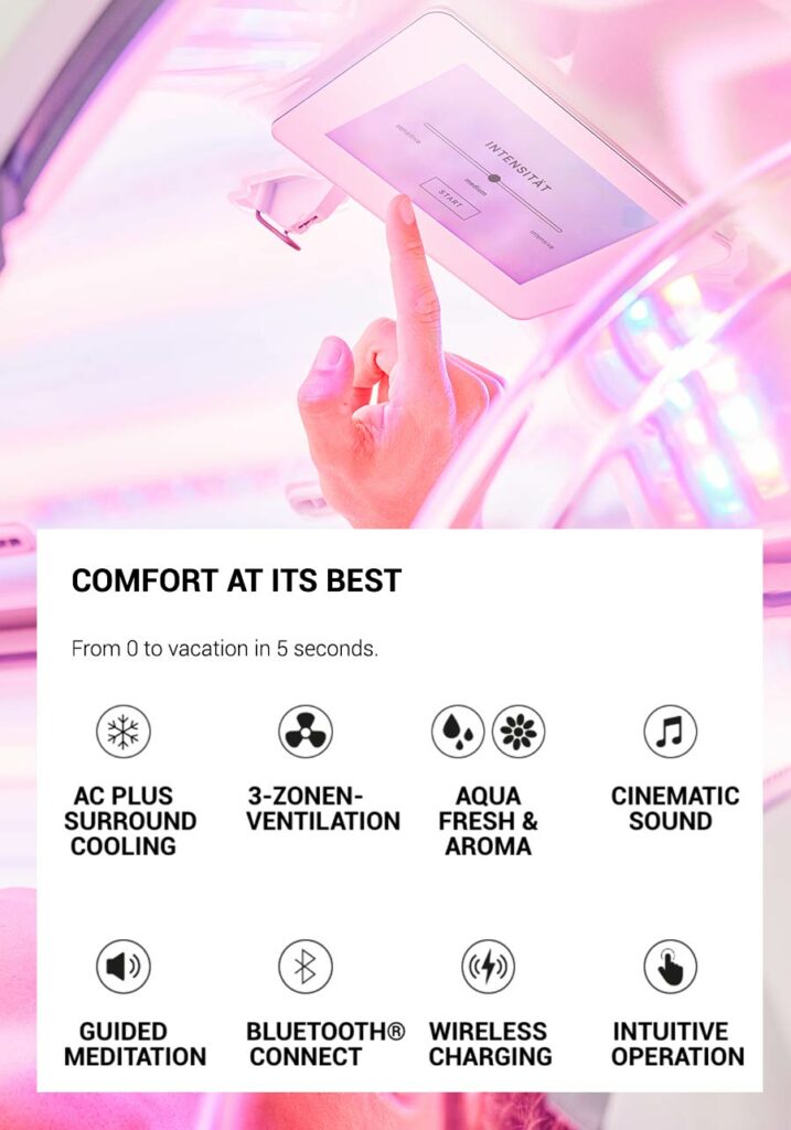 The iconic Edge design makes a clear statement: powerful, distinctive, and elegant Prestige, redefined. The Prestige Edge impresses not only with its unmistakable design language — it also combines premium quality, state-of-the-art UV technology, and maximum comfort. A masterpiece of style, technology and excellence.